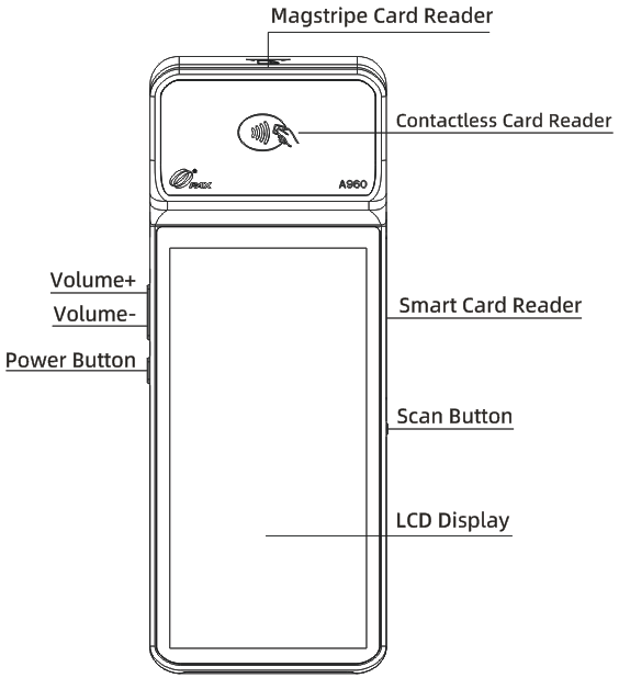 - Power On/Off: Power On: press and hold the Power button for 5 seconds until the LCD lights on, showing that the terminal is being turned on.